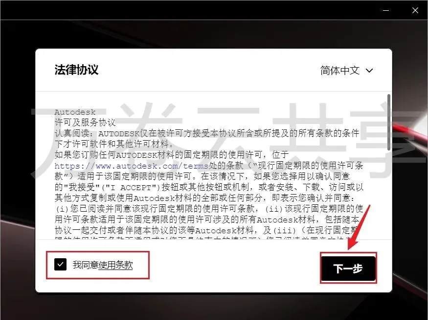 5.勾选→我同意使用条款,点击→下一步