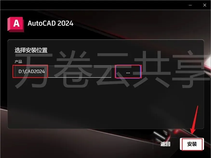 6.点击→…,软件安装的磁盘D盘新建一个CAD2024,点击→安装