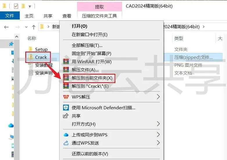 9.打开安装包解压后的→CAD2024精简版(64bit)文件夹,鼠标右击→Crack,选择→解压到当前文件夹解压Crack前:必须要先关闭“所有杀毒软件防火墙、Windows Defender等,否则可能会被杀毒软件误杀删除程序或致无法正常运行
