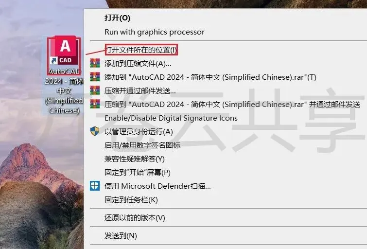 11.鼠标右击→桌面AutoCAD 2024图标,选择→打开文件所在的位置