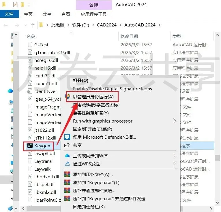 13.鼠标右击粘贴后的Keygen,选择→以管理员身份运行