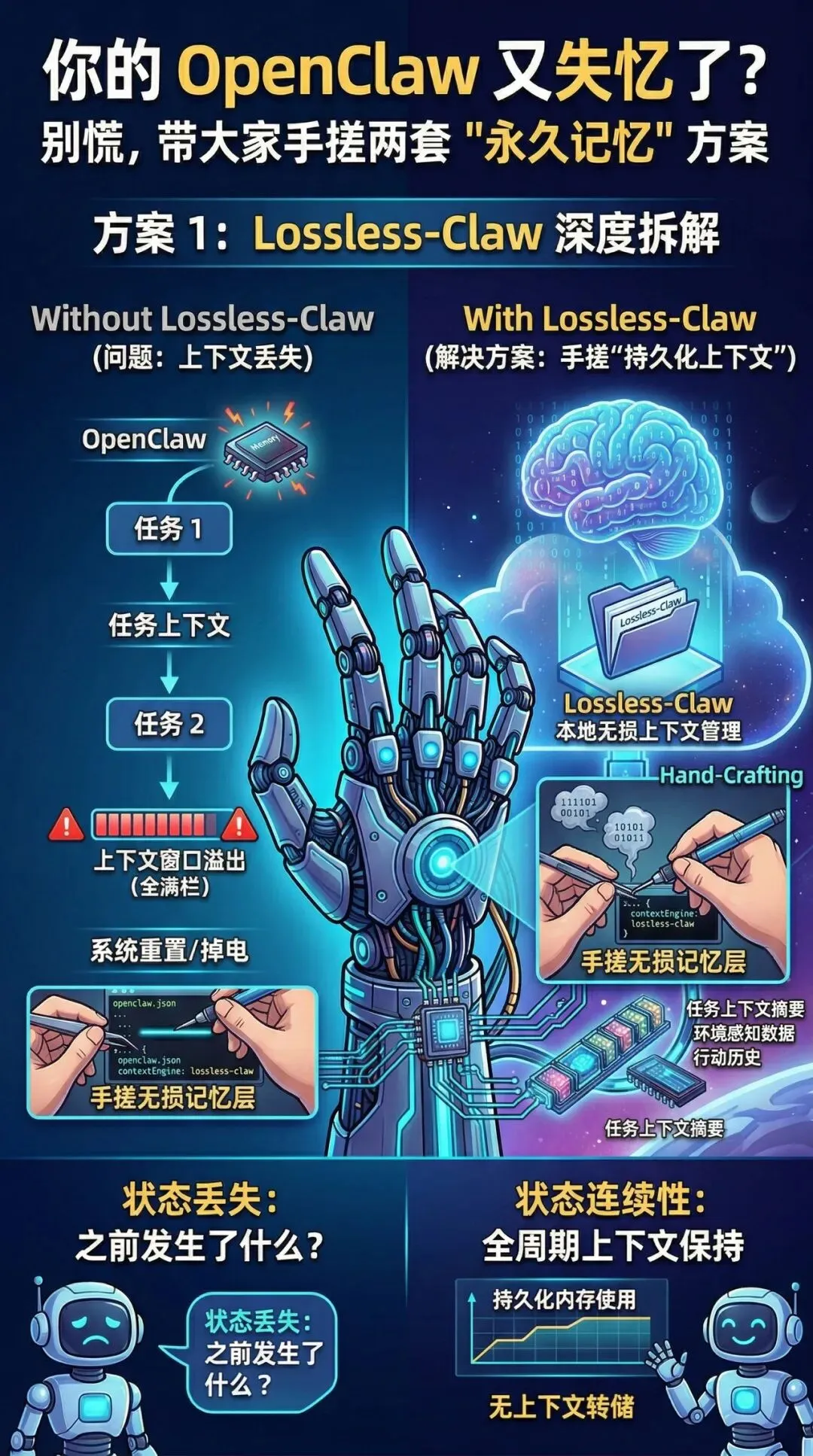 默认的 OpenClaw 在对话太长时,会像"狗熊掰棒子"一样,塞进新指令,丢掉老指令。特别是当你让 Agent 彻夜运行自动化任务时,一觉醒来,它可能连自己是谁都忘了。