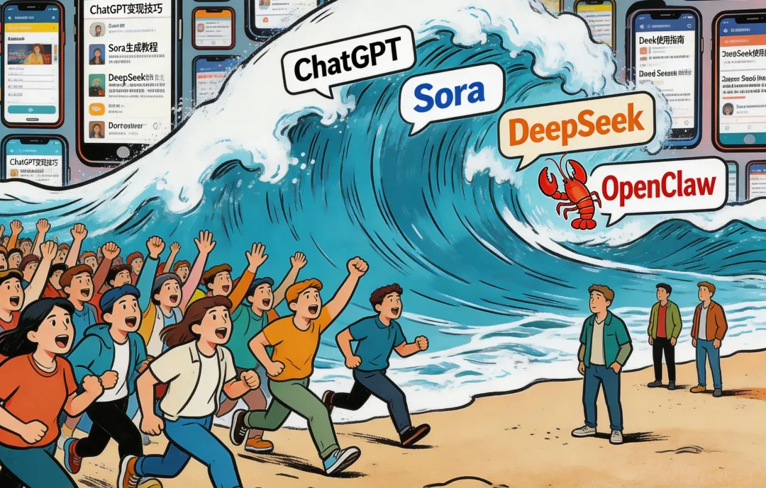 2023年,ChatGPT爆火,全民学prompt。2024年,Sora出来,全民搞AI视频。2025年,DeepSeek刷屏,全民聊国产大模型。2026年,OpenClaw来了,全民养虾。