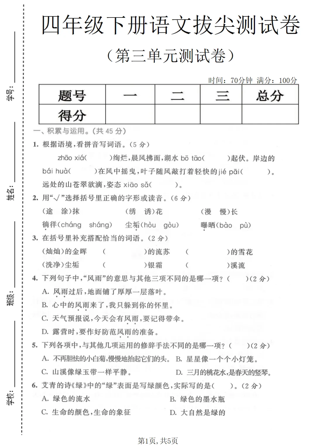 【免费下载】四年级(下)语文 第三单元拔尖测试卷,PDF电子版,可打印,共5页,先保存,以免资源失效