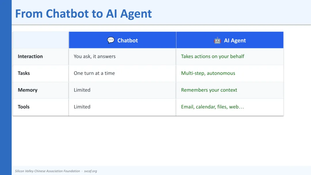研讨会开场就明确了传统聊天机器人和现代 AI 代理的本质区别。聊天机器人只能回答单个问题,而像 OpenClaw 这样的 AI 代理能够自主执行多步任务——代你管理邮件、日历、文件和网页浏览,而你只需要在 Discord、Telegram 或 WhatsApp 上跟它聊天。