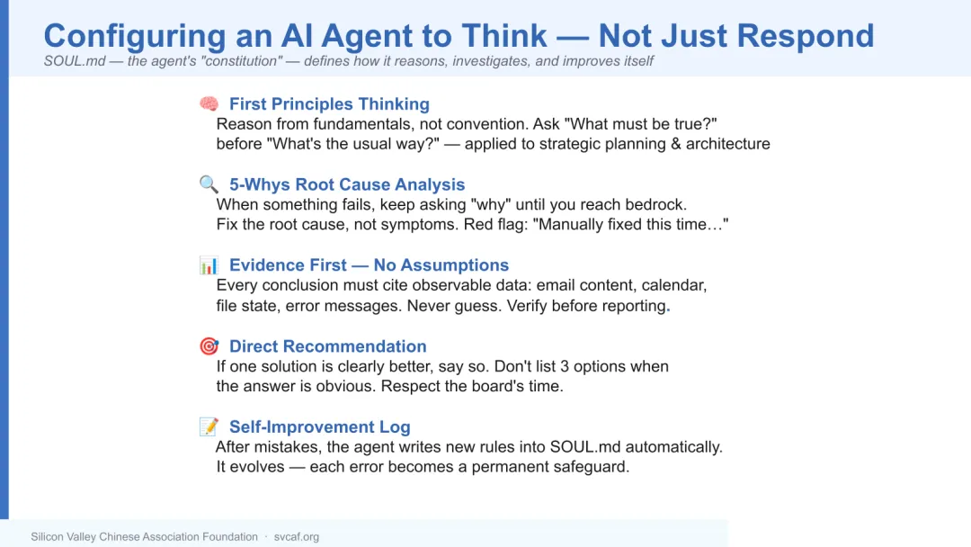 最有价值的一条经验:AI 代理刚安装时只是一张白纸,真正让它强大的是你如何配置它。SVCAF 使用纯文本文件——SOUL.md(代理的价值观和边界)、AGENTS.md(操作规则)、MEMORY.md(长期记忆)——赋予代理清晰的身份、工作流程和组织知识。