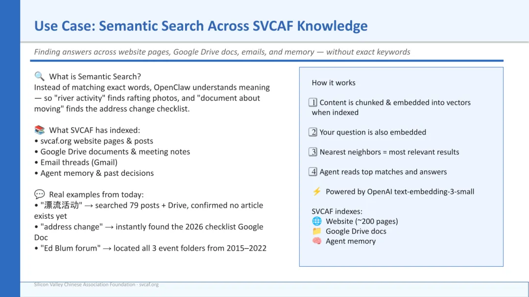 • 语义搜索:在 900+ 份 SVCAF 文档中搜索——会议记录、Drive 文件、网站文章——按语义搜索而非关键词。例如:搜索"漂流活动"立即找到相关存档文章。