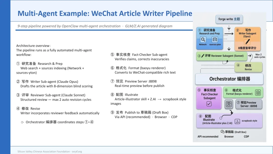• 微信公众号文章流水线:一个9步多代理工作流,从想法到生成配图齐全、经过事实核查、可直接发布的微信文章草稿,耗时5-10分钟。