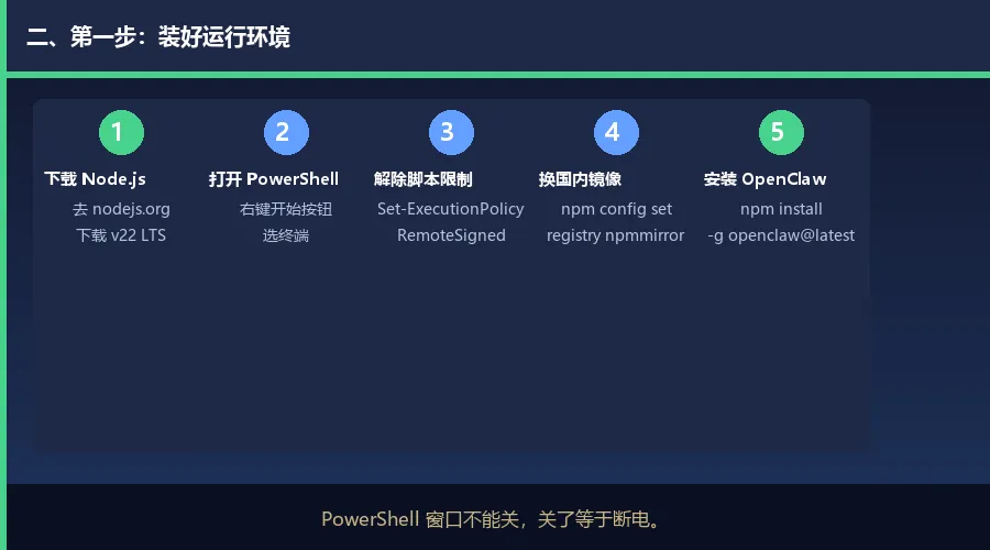 OpenClaw需要Node.js才能跑,先去nodejs.org下载v22 LTS版本,双击安装,一路Next。