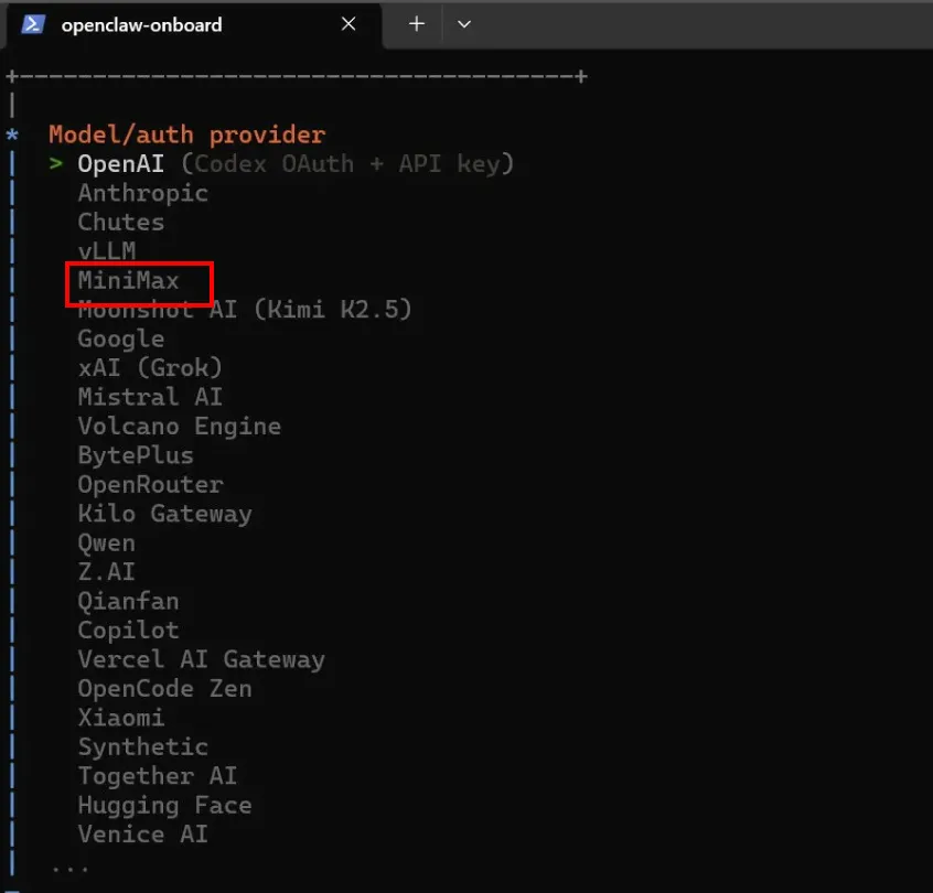 ③ 模型提供商 → 按下方向键翻到MiniMax → 回车