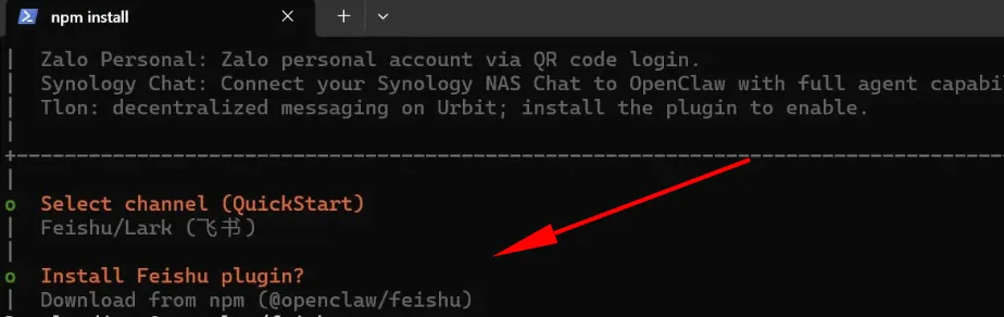 ⑩ 聊天渠道 → 翻到Feishu/Lark → 回车