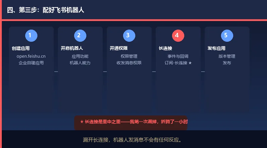 去飞书开放平台open.feishu.cn创建一个企业自建应用,按这个顺序来: