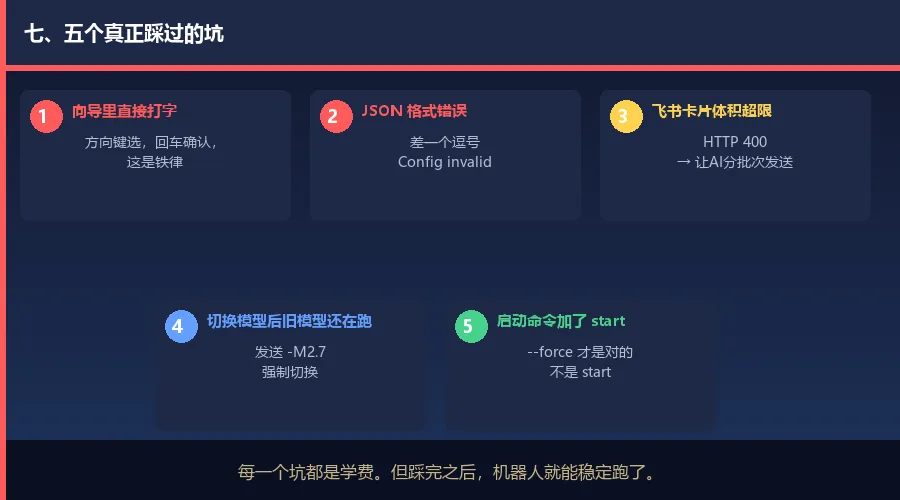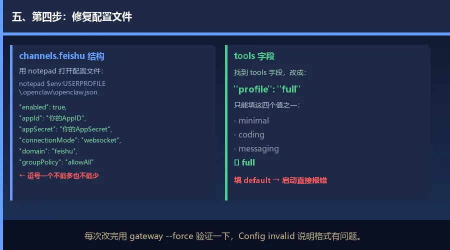 改完配置文件,用openclaw gateway --force启动验证一下,如果报Config invalid就说明格式有问题。