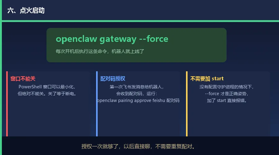 第一次在飞书给机器人发私信,它会回一个配对码,需要新开一个PowerShell窗口运行: