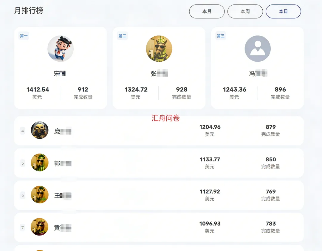 下图是汇舟问卷工作室员工3月份的答题业绩:截止到今天,最高积分已经做到了1412.54美金,其他员工也相对稳定。