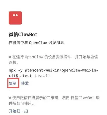 2.复制插件详情页的安装命令,在运行 OpenClaw 的设备终端执行