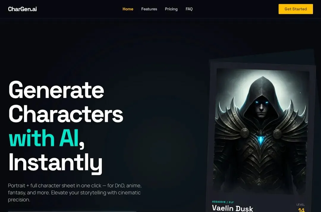 1. 产品名 + 一句话定位 CharGen.ai — AI 角色生成器,一键生成角色头像+完整人设卡2. 目标用户 DnD 玩家、小说创作者、独立游戏开发者3. 配色要求 深色底(#0A0F1C)+ 赛博青(#00E5CC)强调 + 琥珀金辅助4. 页面结构(逐 section 描述) Hero:暗色背景 + 发光输入框 + 右侧浮现角色卡预览 Gallery:3 个不同类型角色卡(战士/动漫/科幻) How It Works:3 步流程(描述→生成→导出) Use Cases:DnD / 小说 / 游戏 / Anime 四张卡片 Features:高对比特性网格 Pricing:Pro 用赛博青发光边框 FAQ:暗色手风琴 Footer:简洁链接5. 消息层级 主标题:Generate Characters Instantly 副标题:Portrait + backstory + stats in 30 seconds CTA:Create My Character — Free6. 定价信息 Free:3/天 | Pro $9/月(200次)| Lifetime $1997. 设计调性关键词 Gaming、Fantasy、Premium、Dark Mode8. 反 AI 味要求(重要!) 不要紫蓝渐变、不要对称 3 列、不要 emoji 做 icon、 不要每个 section 背景色交替白/灰为什么要写"反 AI 味要求"?