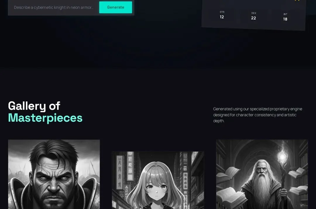 Hero 区:深色背景 + 赛博青强调 + 右侧浮现角色卡(带属性值 STR/DEX/INT),左侧输入框 placeholder "Describe a cybernetic knight in neon armor..."