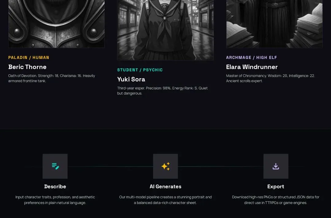 角色画廊:3 个不同风格的示例角色(战士、动漫少女、魔法师),展示生成能力的多样性。