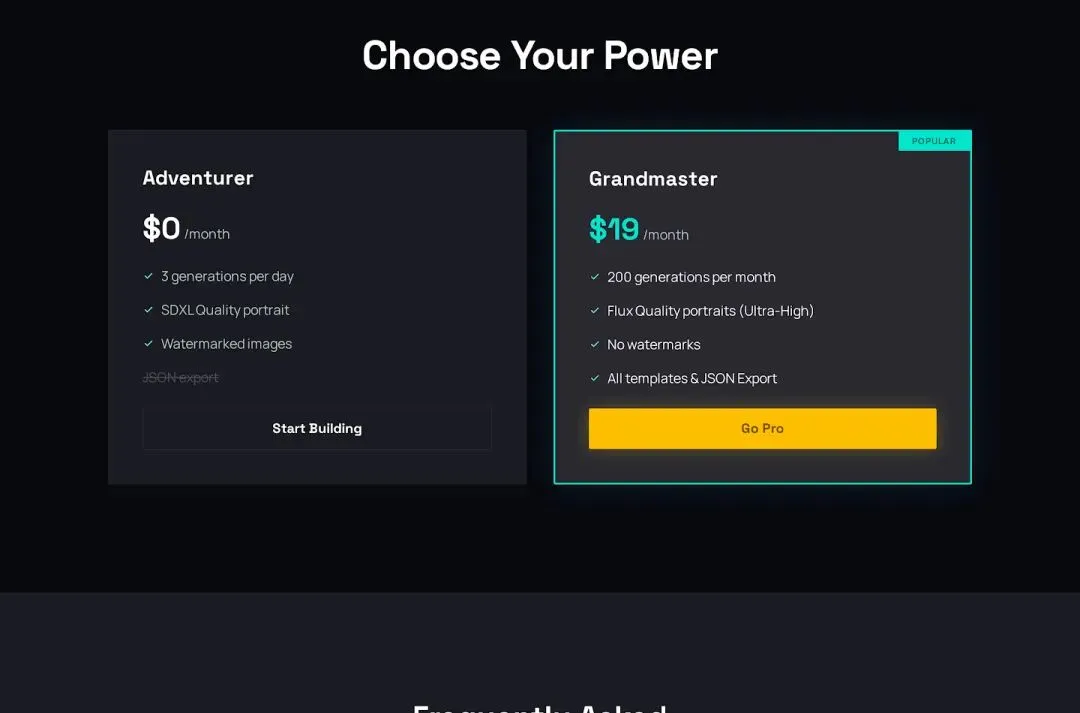 Pricing 区(截图里还有 FAQ 部分):