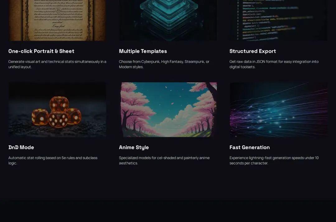 Features Grid:6 大功能——图片+人设一键生成、多风格模板、结构化导出、DnD 模式、Anime 风格、快速生成。每个功能配独立场景配图。