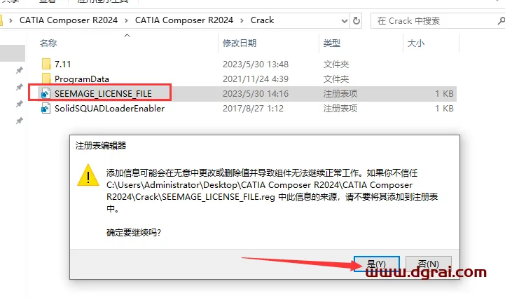 3、在安装包里面双击运行SEEMAGE_LICENSE_FILE.reg,弹出对话框,点击是