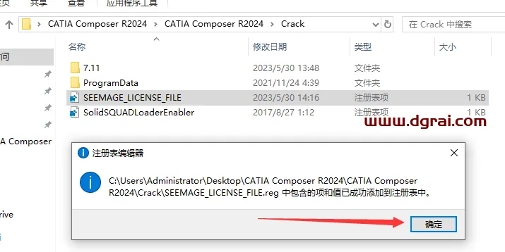 4、SEEMAGE LICENSE FILE.reg 中包含的项和值已成功添加到注册表中,点击确定