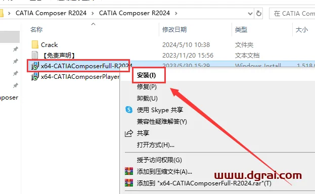 5、选择安装程序x64-CATIAComposerFull-R2024.msi鼠标右键点击【安装】