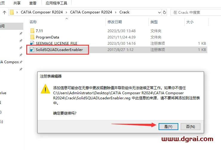 18、双击运行SolidSQUADLoaderEnabler.reg,弹出对话框,点击是