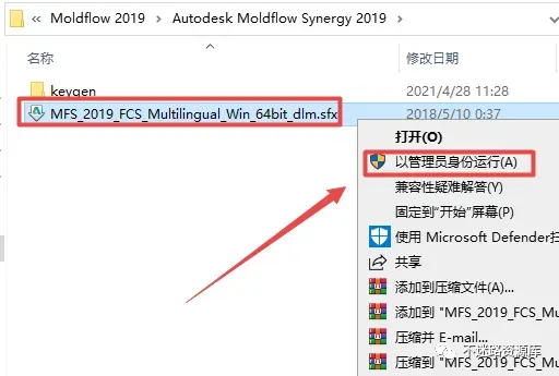 10.接下来安装Moldflow Insight,返回之前解压的“Moldflow 2019”文件夹,双击打开“Autodesk Moldflow Insight 2019”文件夹,找到并选中“MFIA_2019_FCS_Multilingual_Win_64bit_dlm.sfx”,鼠标右键点击“以管理员身份运行”