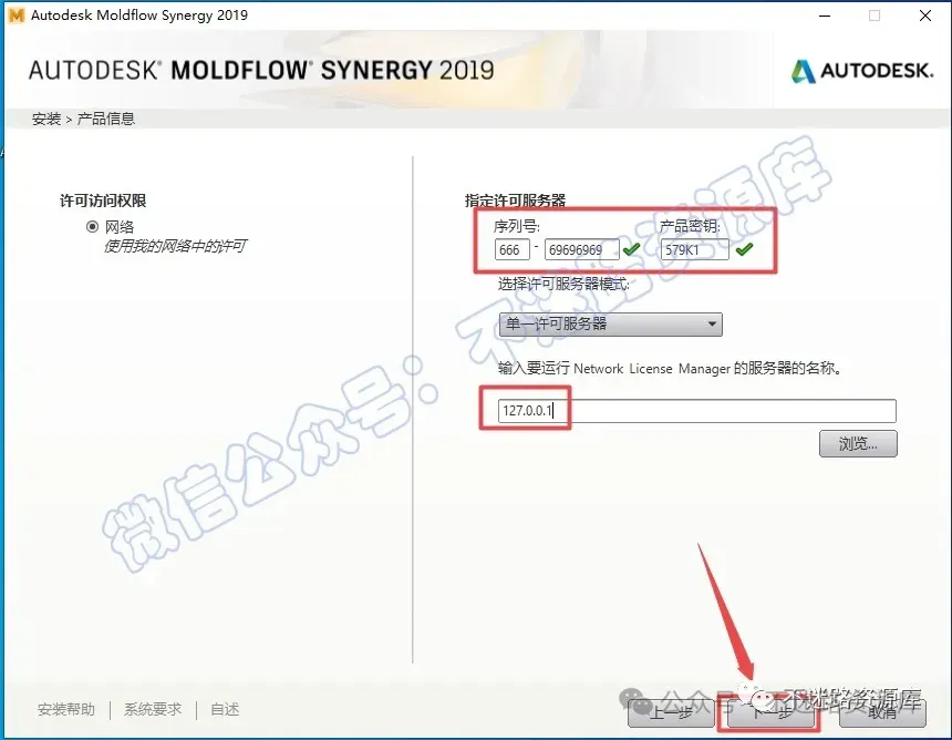 6.输入序列号:“666-69696969”,输入产品密钥:“579K1”,输入服务器名称”127.0.0.1”,点击“下一步”