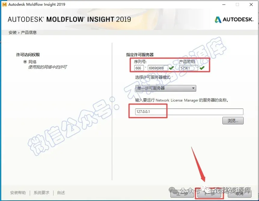 14.输入序列号:“666-69696969”,输入产品密钥:“575K1”,输入服务器名称”127.0.0.1”,点击“下一步”