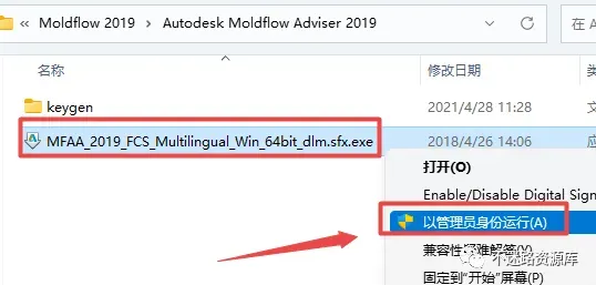 19.接下来安装Moldflow Adviser,返回之前解压的“Moldflow 2019”文件夹,双击打开“Autodesk Simulation Moldflow Adviser 2019”文件夹,找到并选中“MFAA_2019_FCS_Multilingual_Win_64bit_dlm.sfx.exe”,鼠标右键点击“以管理员身份运行”
