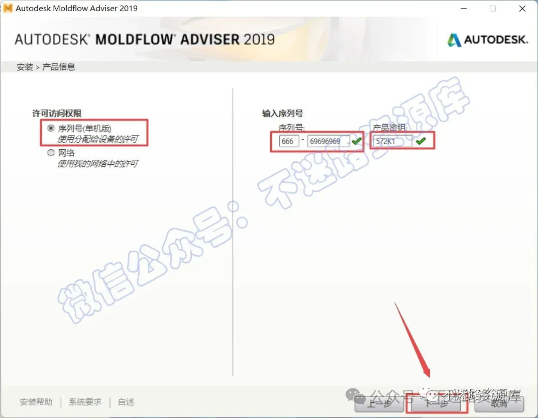 23.点击“单机版”,输入序列号:“666-69696969”,输入产品密钥:“572K1”,点击“下一步”