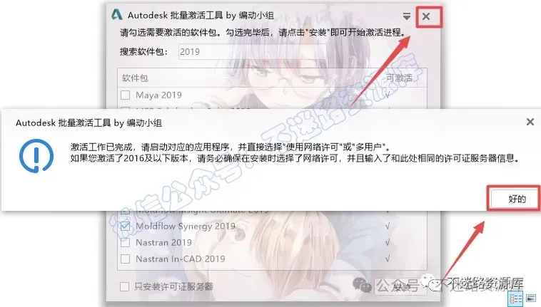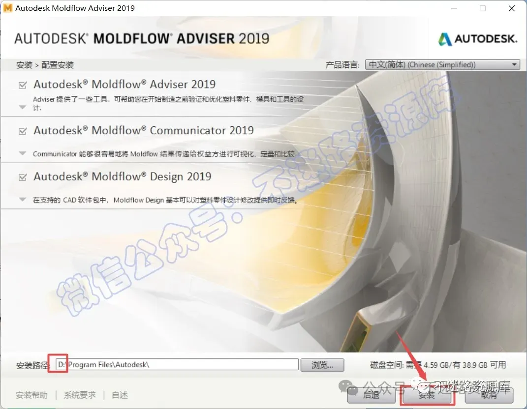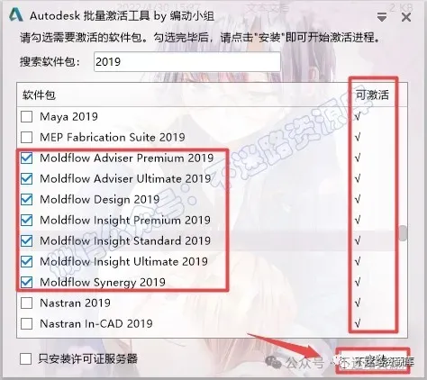 30.可激活列显示为“√”,找到并勾选Moldflow 2019系列软件,如下图所示,点击“安装”