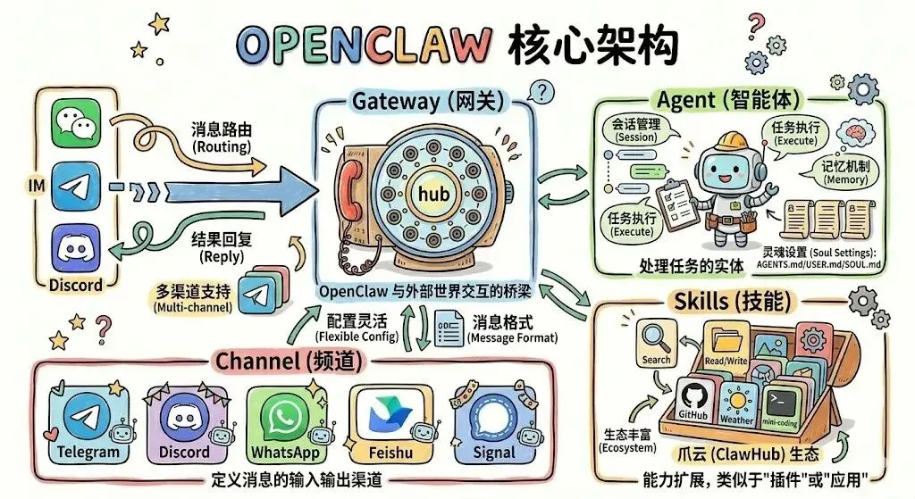 OpenClaw的核心架构,就像这张图中所展示的一样: