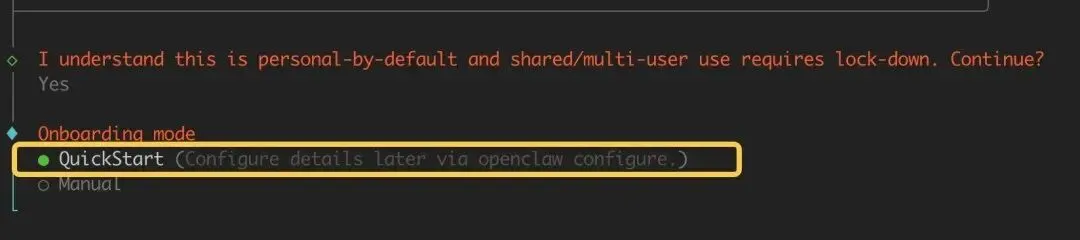 openclaw onboard --install-daemon选择 QuickStart 快速开始配置: