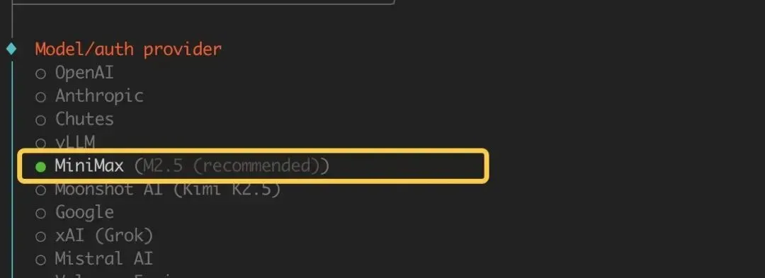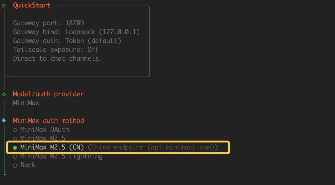 认证方式选择:MiniMax M2.5(CN),意思是国内版本,通过API Key 方式做认证: