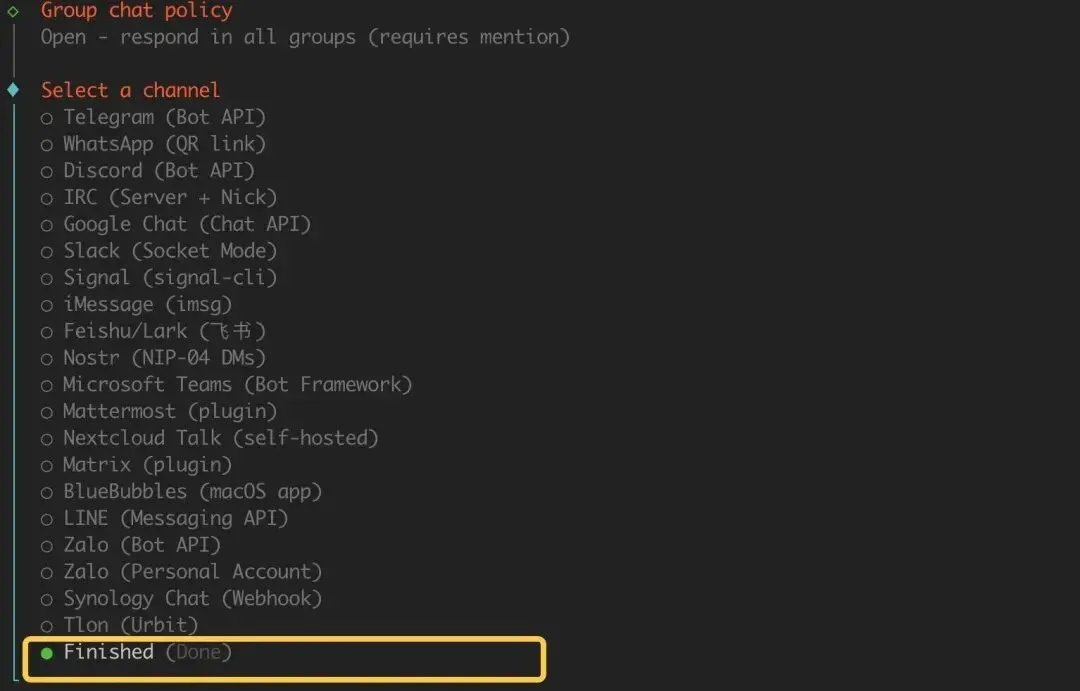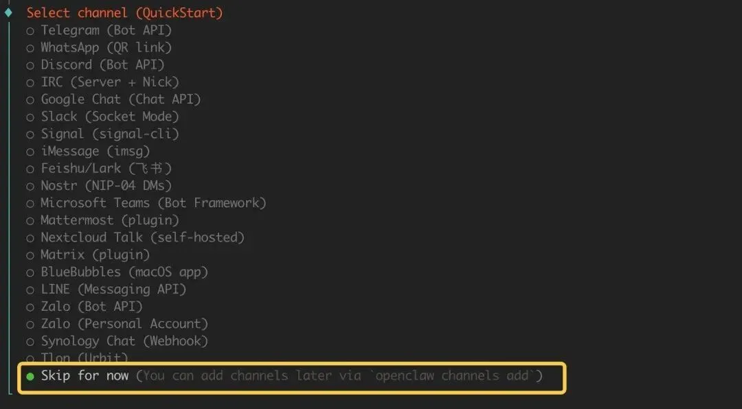Channel 选择,暂时跳过,后面单独介绍接入飞书和Discord: