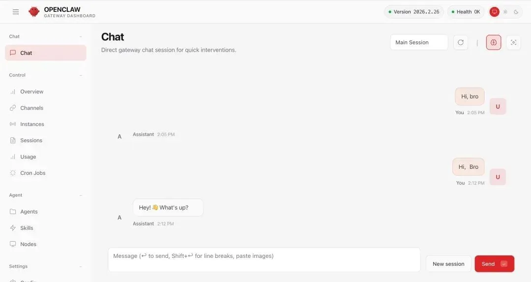这个就是 OpenClaw Web 端,后面也可以通过 openclaw dashboard 命令来打开。