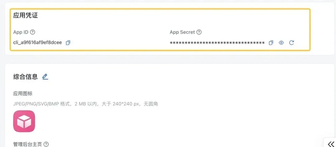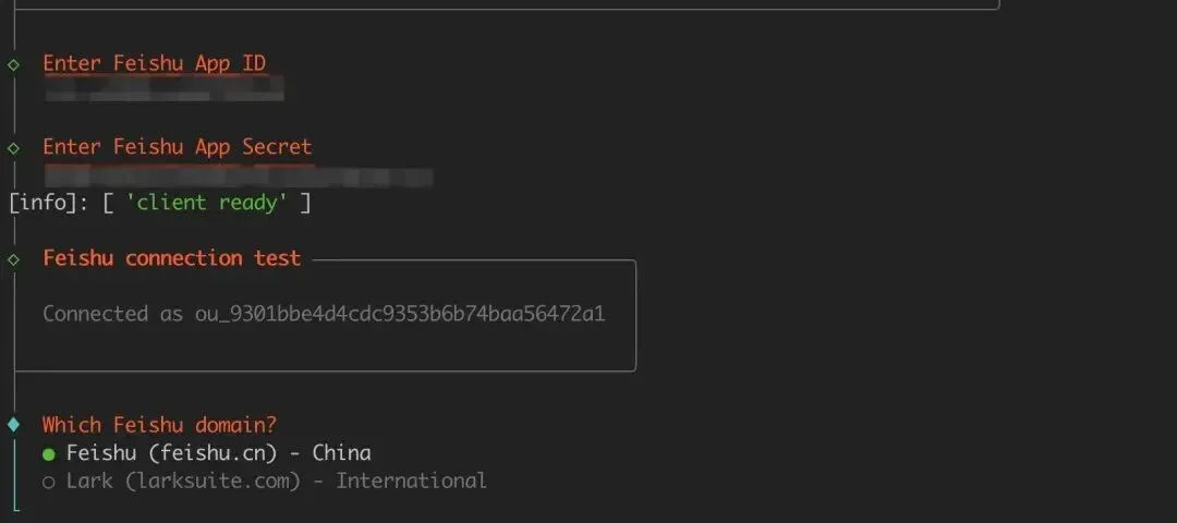 按提示输入创建飞书应用时保存的App ID 和App Secret: