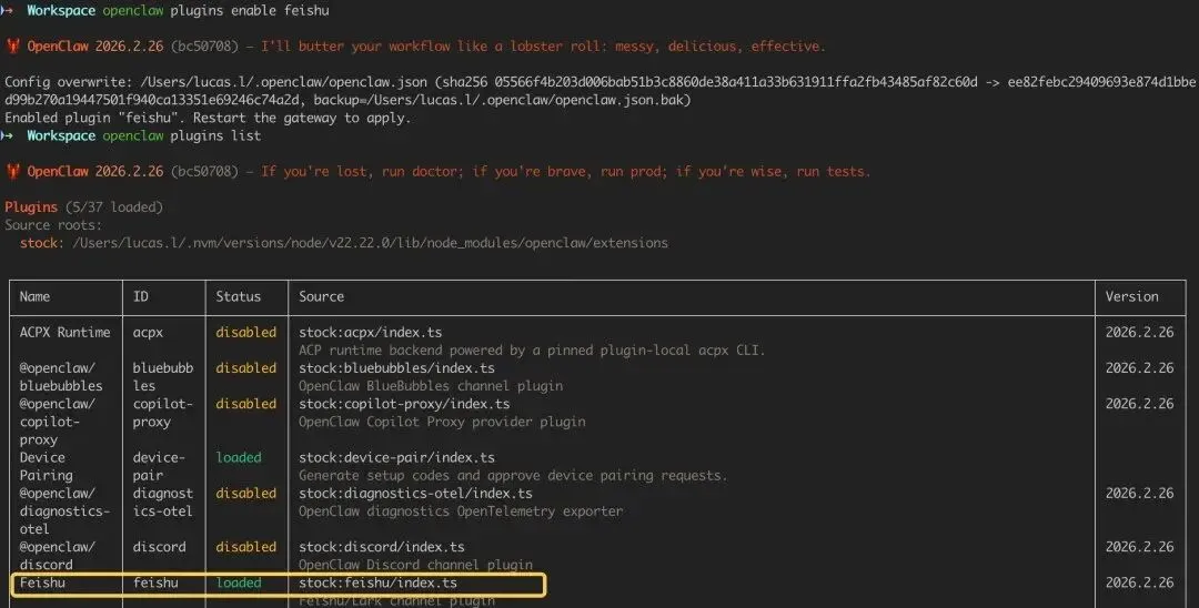 使用命令:openclaw plugins enable feishu 开启 OpenClaw 内置的飞书插件,默认是disable 状态,loaded 为开启。