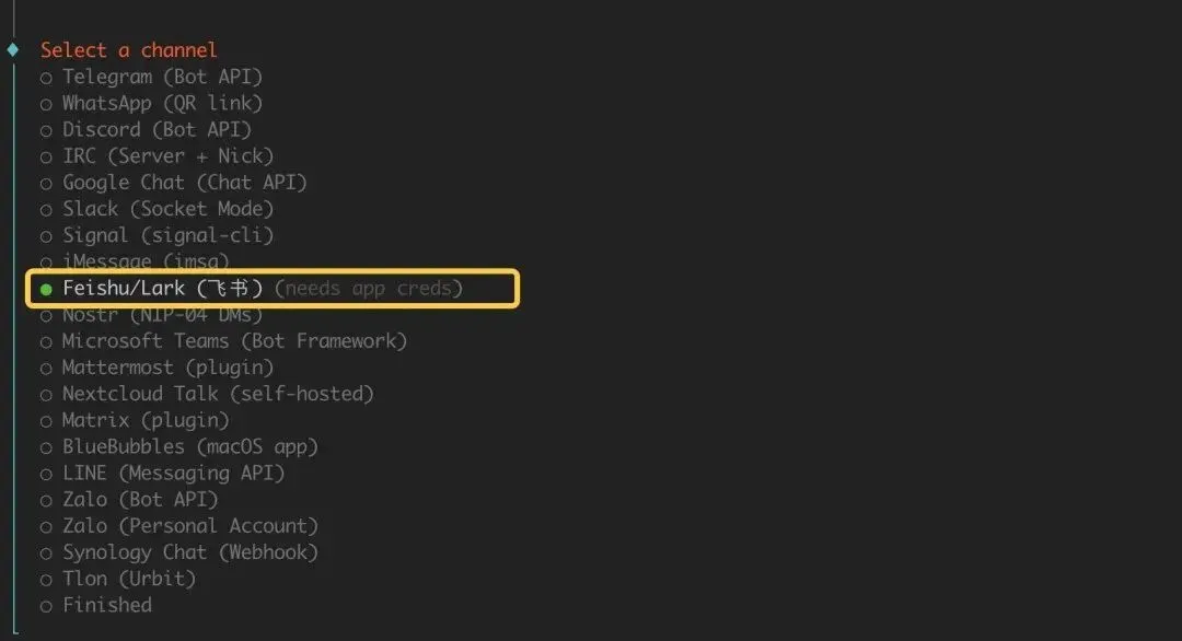 选择 Feishu/Lark (飞书):