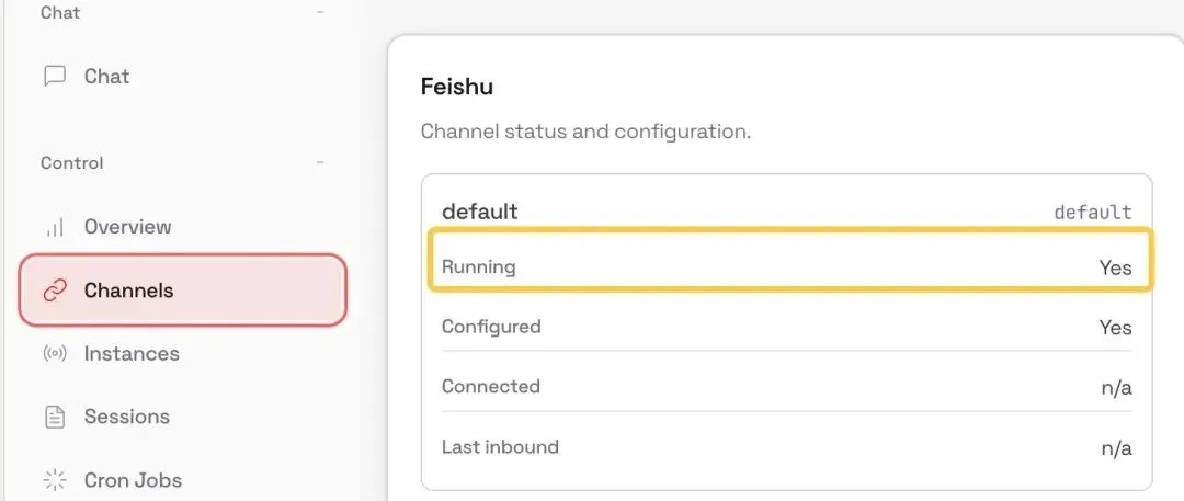 Web 端 Channels 页可以看到飞书是 Running 状态, 就是配置好了。