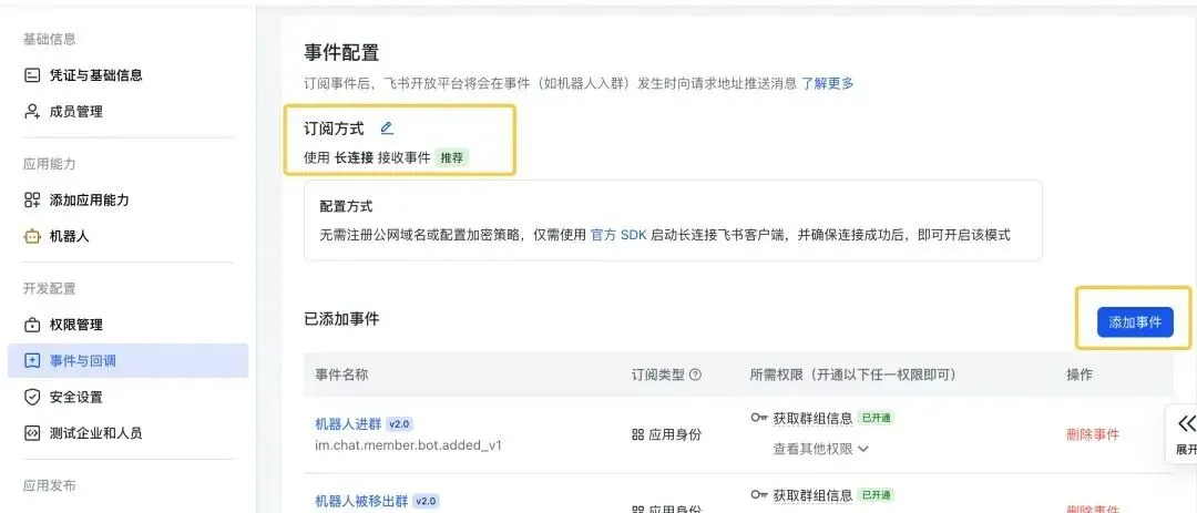 订阅方式选默认推荐的 长连接,添加上以下事件