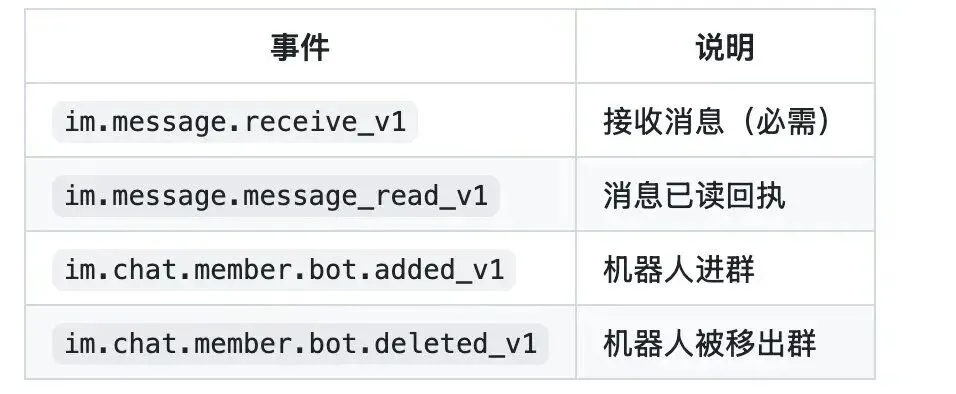 { "scopes": { "tenant": [ "cardkit:card:write", "contact:contact.base:readonly", "contact:user.base:readonly", "im:chat:readonly", "im:message", "im:message.group_at_msg:readonly", "im:message.group_msg", "im:message.p2p_msg:readonly", "im:message.reactions:read", "im:message:readonly", "im:message:recall", "im:message:send_as_bot", "im:message:update", "im:resource" ], "user": [ "contact:contact.base:readonly" ] } }为应用订阅相关事件