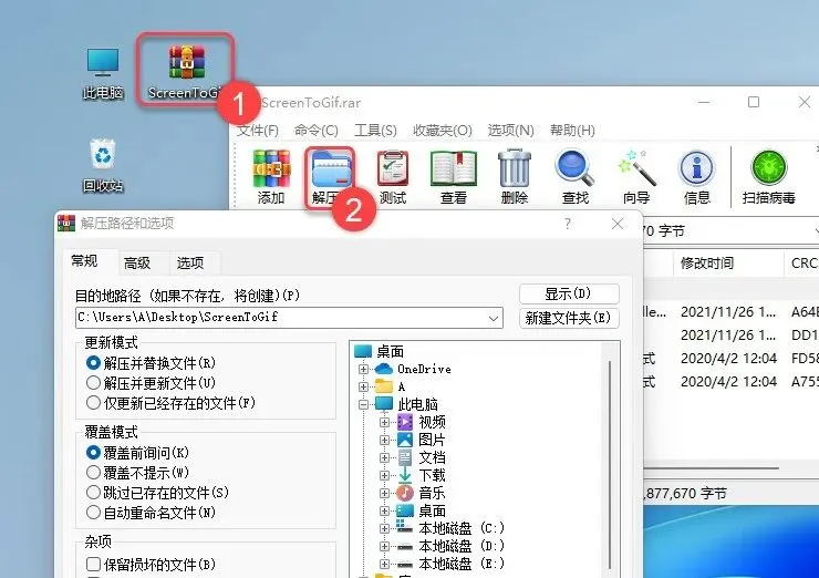1.解压安装包:①双击【ScreenToGif】压缩包②点击【解压到】③点击【确定】。