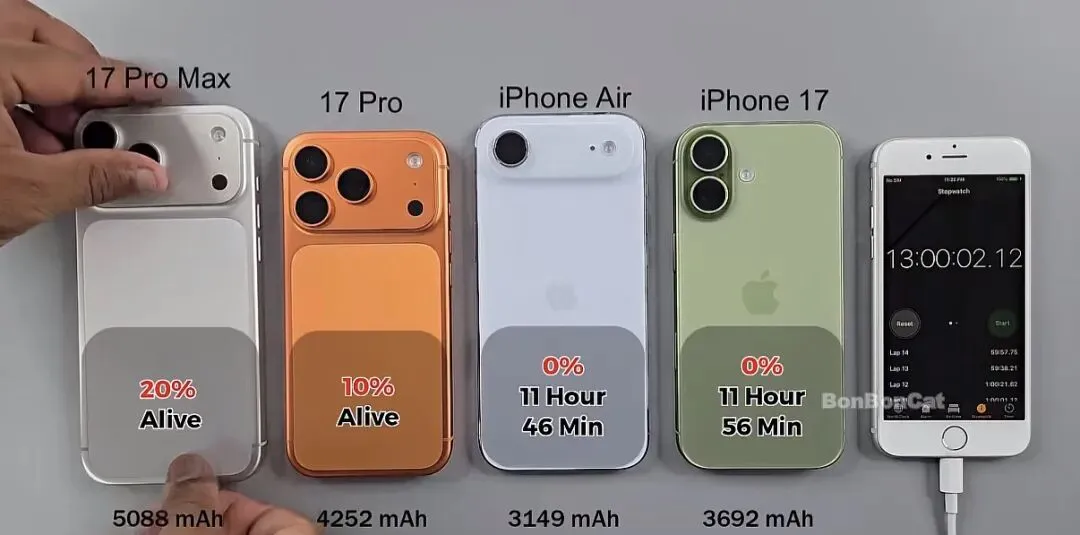 iPhone 17系列中,标准版与Air机型的表现尤为亮眼。iPhone 17搭载3692mAh电池,以11小时56分钟的持续运行时间,证明了其在能效管理上的突破;iPhone Air虽电池容量仅3149mAh,却跑出11小时46分钟的成绩,与标准版差距极小。相比之下,iPhone 17 Pro(4252mAh)剩余电量10%,iPhone 17 Pro Max(5088mAh)剩余20%,虽电池容量更大,但高刷新率屏幕与高性能处理器带来的功耗,使其在测试中剩余电量较少。这一对比揭示了新系列的能效策略:标准版与Air机型通过A19芯片的能效优化,以更小电池实现长续航;Pro系列则在性能与续航间寻求平衡,适合追求极致体验的用户。