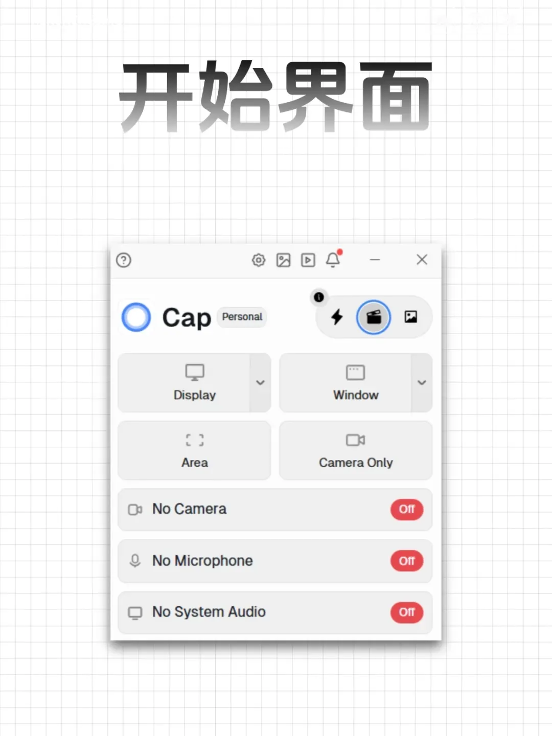 Cap可以录制整个屏幕,某个窗口,甚至是自定义区域,可以同时录制摄像头的画面,也可以录制麦克风和电脑系统内部的声音。