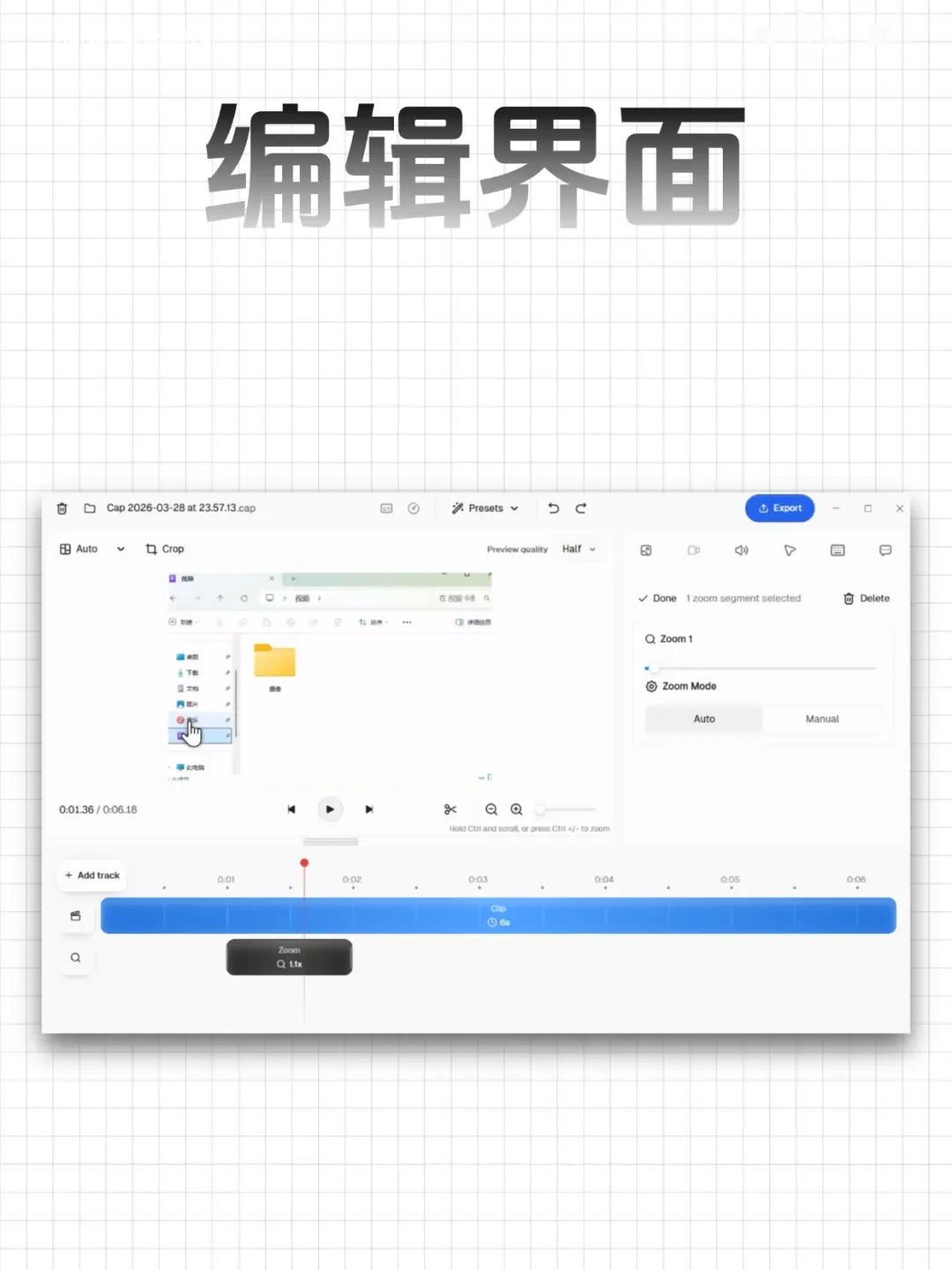使用起来也非常简单,录制好画面之后,会跳转到编辑界面,在进度条下面点一下,就有个小黑块,点击就能调整要放大的画面,时间段和放大的倍数。
